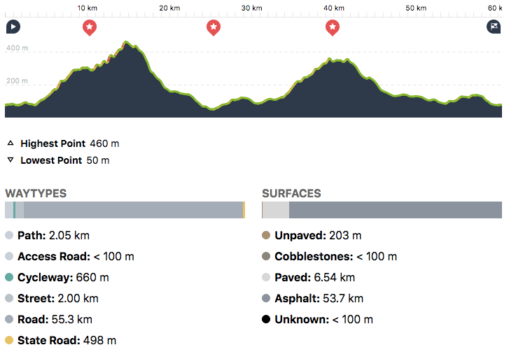 Distance: 63 km | Elevation gain: 1,015 m (max elevation: 480 m)