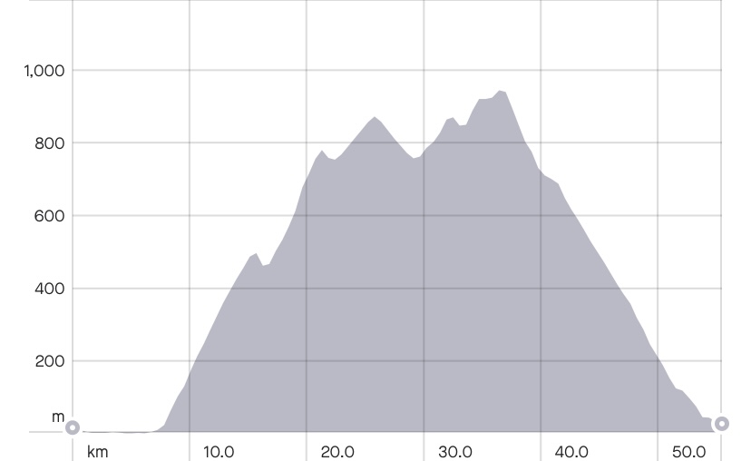 Distance: 55 km | Elevation gain: 1200 m (max elevation 947 m)